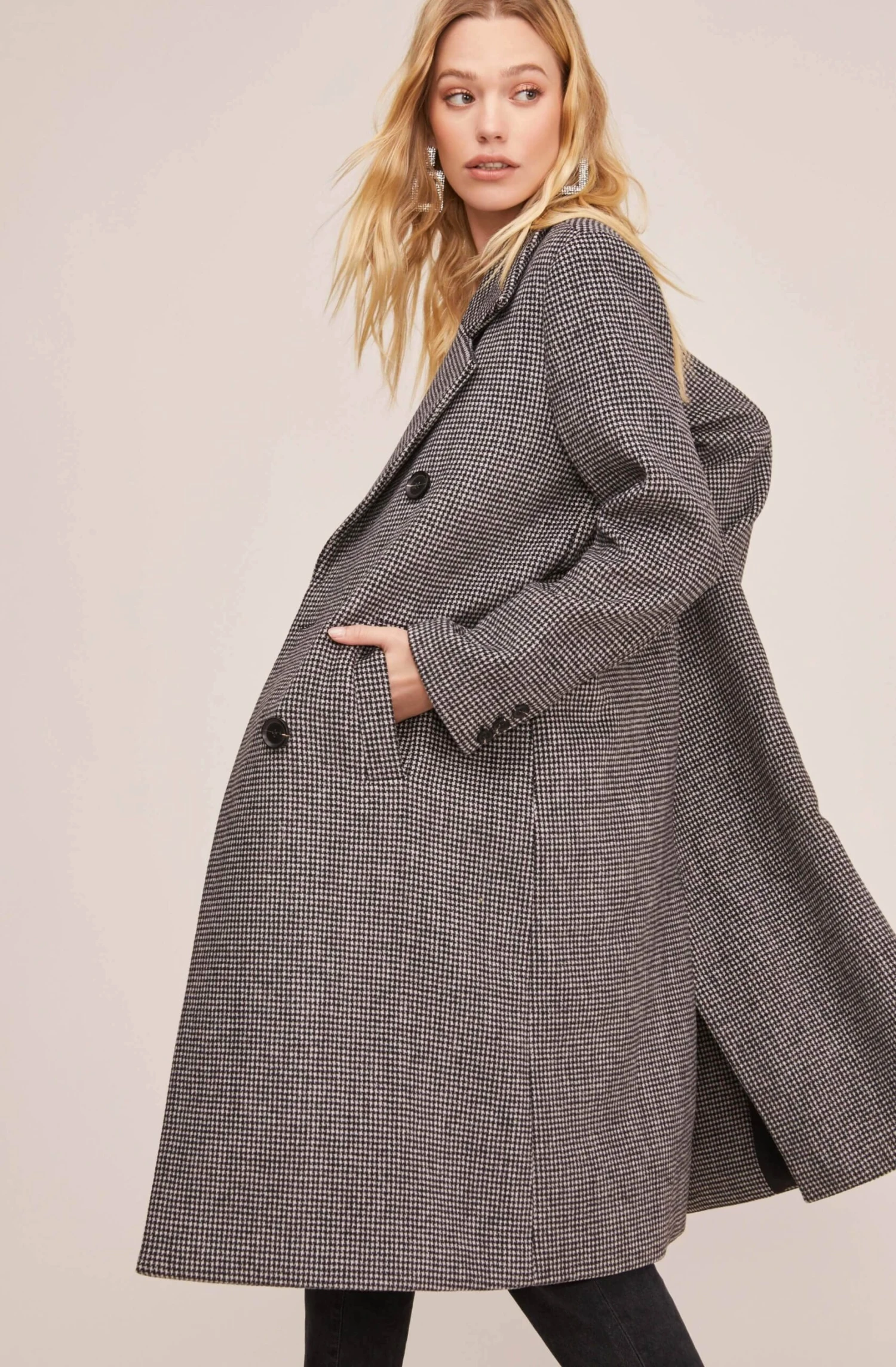 Take cover from the cold with the Vernon Houndstooth Coat. Longline silhouette leads to a statement notched lapel and double-breasted front. Double side pockets and long sleeves. Vented back.